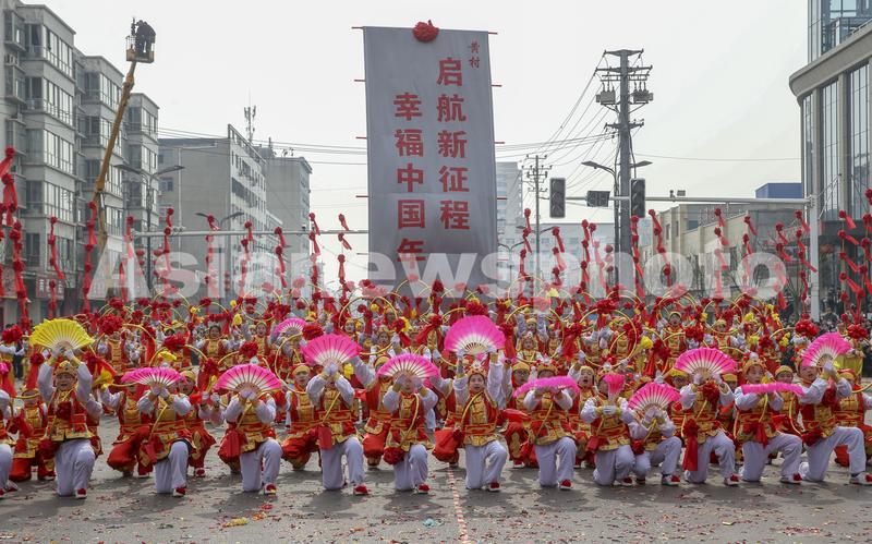 2023年2月5日,元宵节,山西省河津市举行“鱼跃龙门幸福河津”社火表演庆元宵,黄村村民表演的舞蹈《开启新征程幸福中国年》。