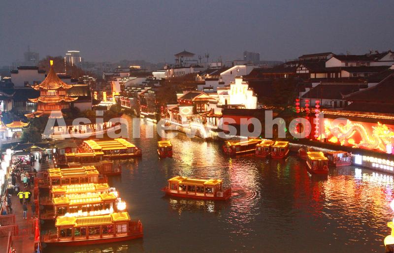 图片说明:2023年2月5日,江苏省南京市,游客乘坐画舫在南京夫子庙景区秦淮河上观光游览。