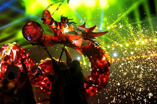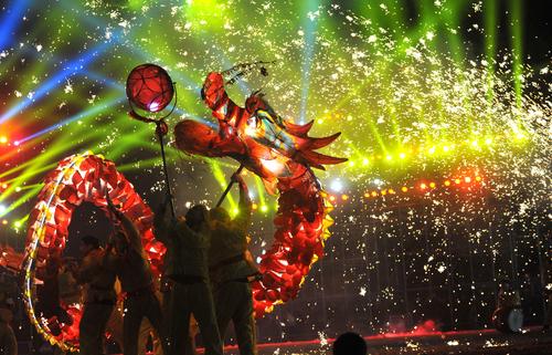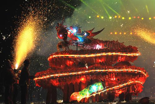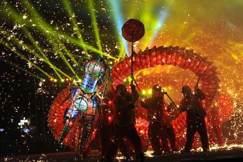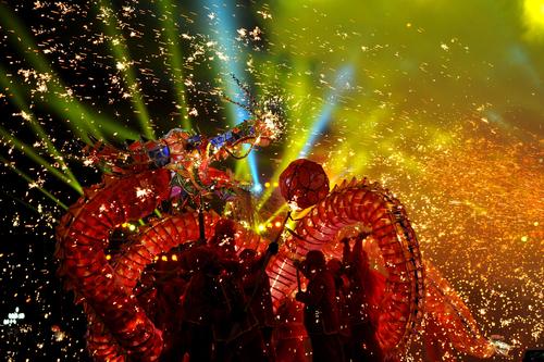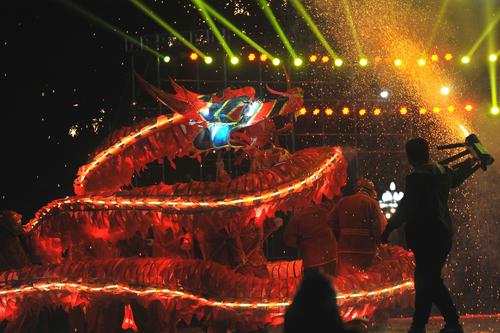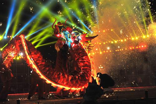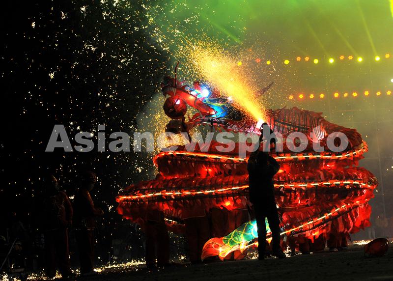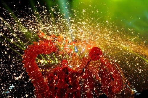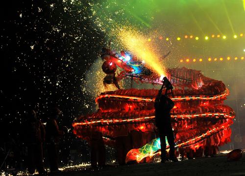 2023年2月4日,人们在贵州省台江县姊妹广场表演“舞龙嘘花”。
