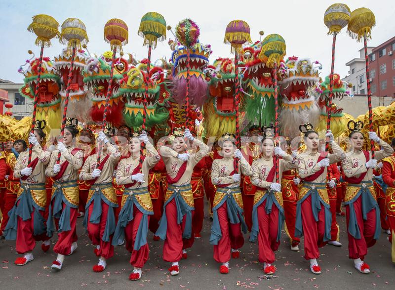 2023年2月5日,元宵节,山西省河津市举行“鱼跃龙门幸福河津”社火表演庆元宵,城区街道办祝福舞蹈《龙舞盛世》。