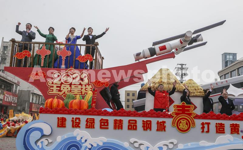 2023年2月5日,元宵节,山西省河津市举行“鱼跃龙门幸福河津”社火表演庆元宵,阳村街道办彩车《远航吧河津》。