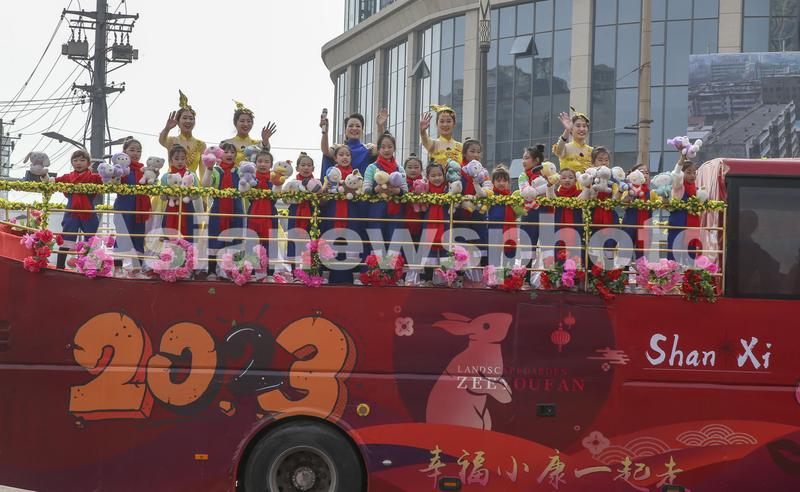 2023年2月5日,元宵节,山西省河津市举行“鱼跃龙门幸福河津”社火表演庆元宵,城区街道办彩车《致敬2023》。