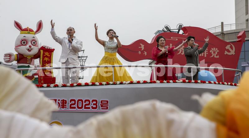 2023年2月5日,元宵节,山西省河津市举行“鱼跃龙门幸福河津”社火表演庆元宵,城区街道河津2023号彩车奋进河津。