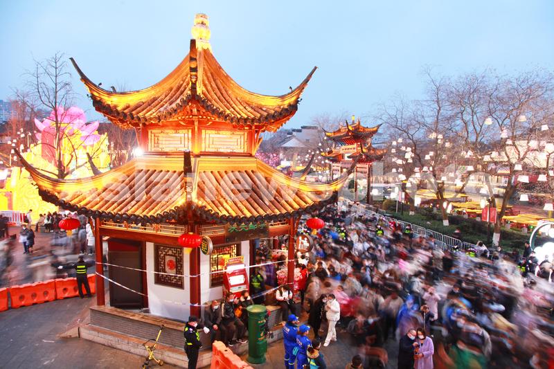 图片说明:2023年2月5日,江苏省南京市,游客在南京夫子庙景区赏灯观景。