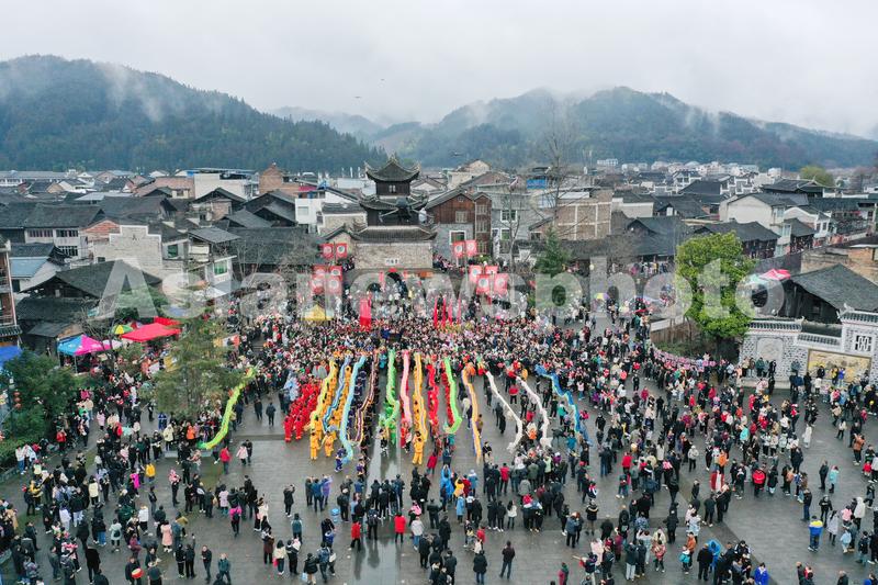 图片说明:2023年2月5日,人们在贵州省黔东南苗族侗族自治州锦屏县隆里古城参加“花脸龙”活动。