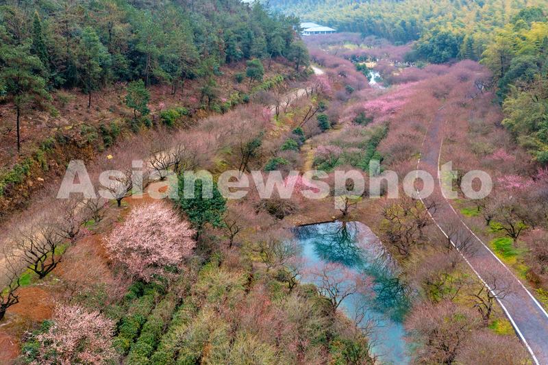 2023年2月7日,浙江省湖州市长兴县龙山街道东方梅园,五颜六色的梅花争奇斗艳,在绿山青山的映衬下如美如画。
