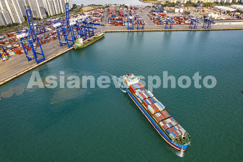 2023年2月7日,航拍海口港集装箱码头正在装卸集装箱,现场一派繁忙景象。