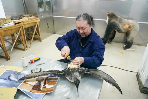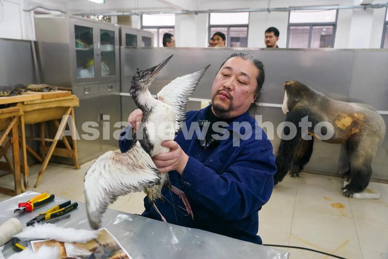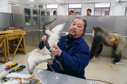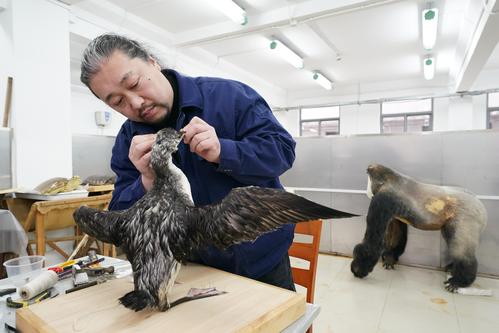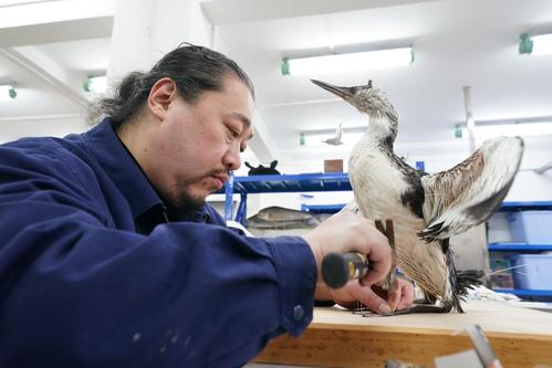 图片说明:2月8日,上海科技馆藏品保护中心标本制作部标本师马鸣一制作黑喉潜鸟标本。