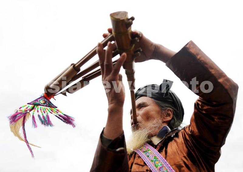 2月7日,在广西柳州市融水苗族自治县安陲乡大田村,一老者吹奏芦笙为芒篙舞伴奏。