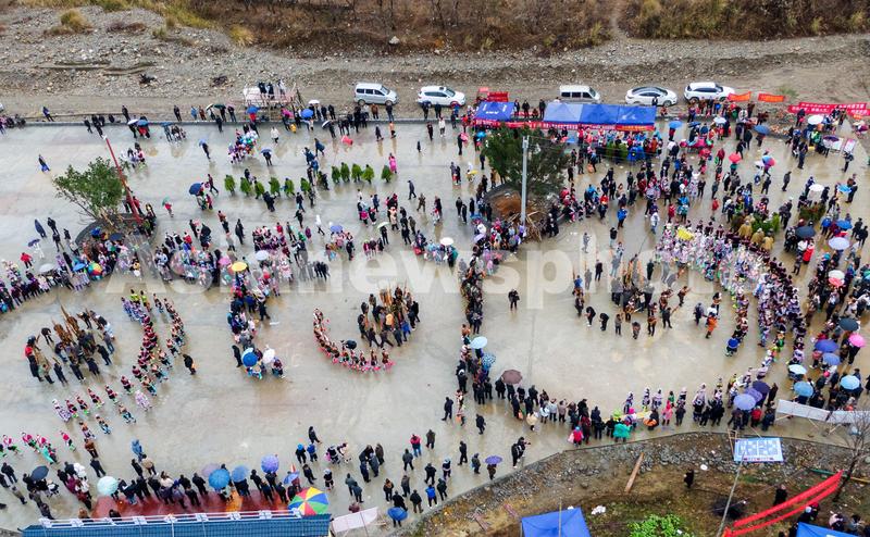 2月7日,在广西柳州市融水苗族自治县安陲乡大田村,村民在踩堂,“芒篙”在游走。(无人机照片)