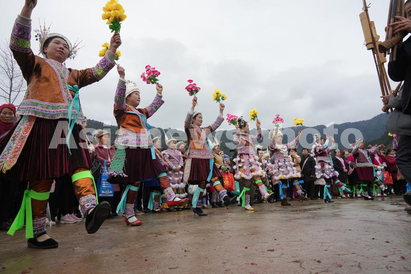 2月7日,在广西柳州市融水苗族自治县安陲乡大田村,苗家女载歌载舞。