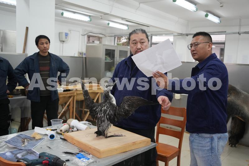 图片说明:2月8日,上海科技馆藏品保护中心标本制作部标本师马鸣一(中)和同事制作黑喉潜鸟标本。