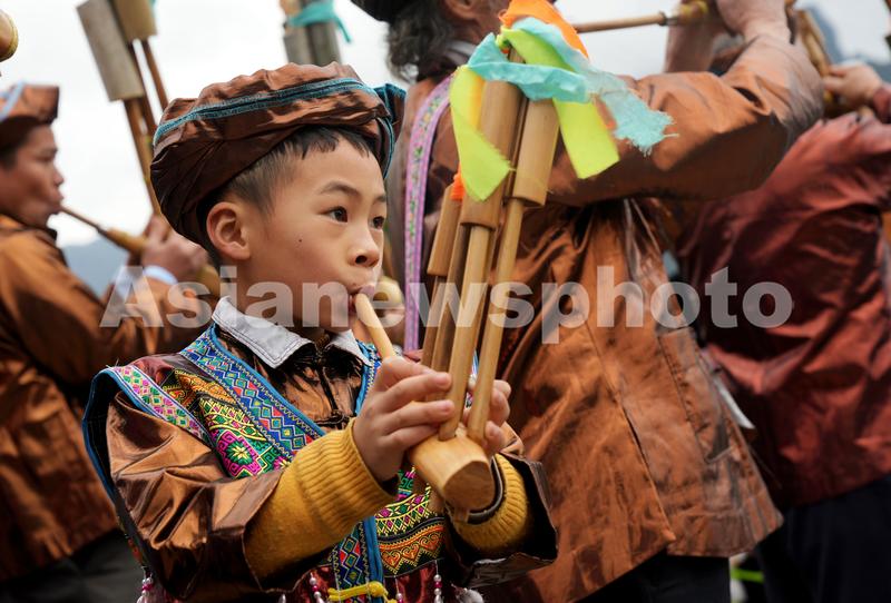 2月7日,在广西柳州市融水苗族自治县安陲乡大田村,一小朋友吹奏芦笙为芒篙舞伴奏。