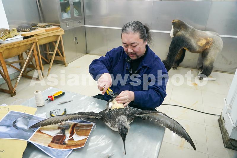 图片说明:2月8日,上海科技馆藏品保护中心标本制作部标本师马鸣一制作黑喉潜鸟标本。