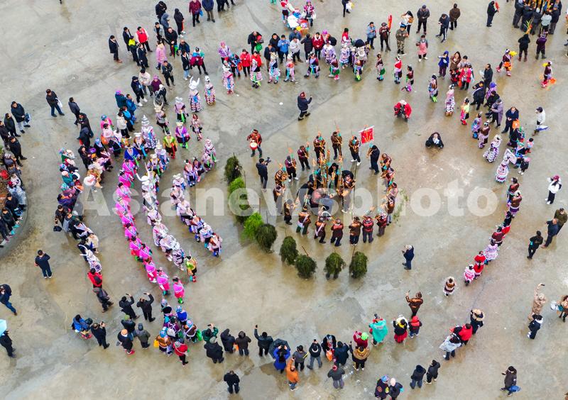 2月7日,在广西柳州市融水苗族自治县安陲乡大田村,“芒篙”与村民一起踩堂。(无人机照片)
