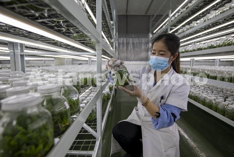 图片说明:2023年2月7日,工作人员在贵州省从江县贯洞镇铁皮石斛种苗繁育基地组培室管理种苗。