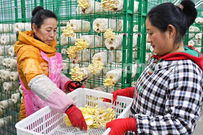 图片说明:2023年2月13日,村民在山东省烟台市福山区张格庄镇食用菌产业园蘑菇大棚内采摘金顶侧耳。