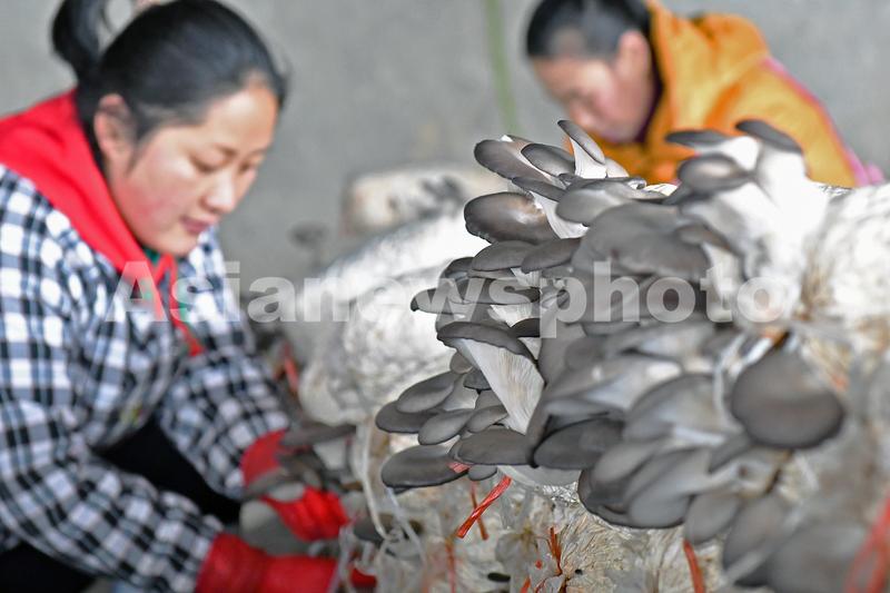 图片说明:2023年2月13日,村民在山东省烟台市福山区张格庄镇食用菌产业园蘑菇大棚内采摘平菇。