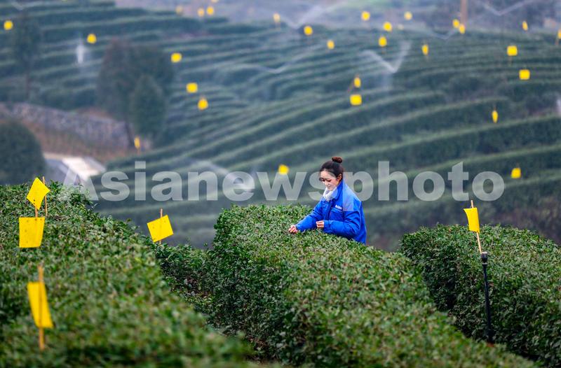 2023年2月12日,在四川省宜宾市筠连县巡司镇银星村八一茶山,茶企员工正在采摘早茶。