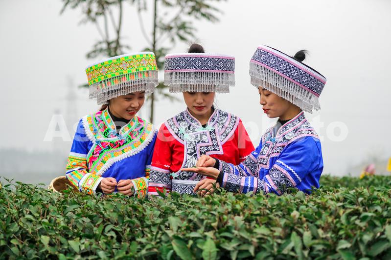 2023年2月12日,在四川省宜宾市筠连县巡司镇银星村八一茶山,茶企员工正在采摘早茶。