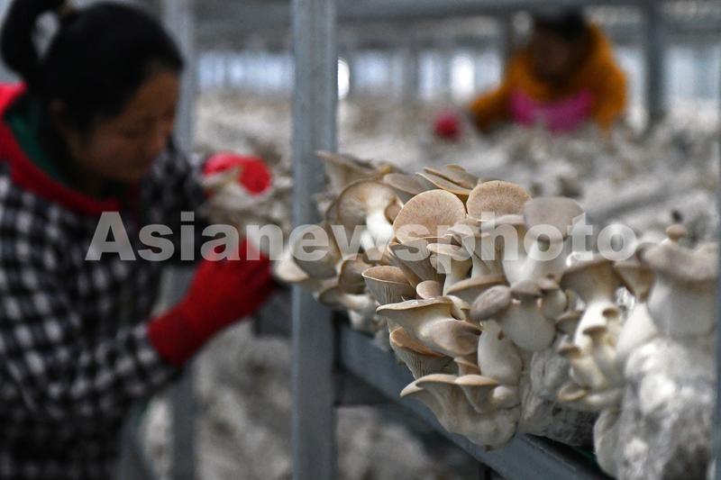 图片说明:2023年2月13日,村民在山东省烟台市福山区张格庄镇食用菌产业园蘑菇大棚内采摘雪莲菇。