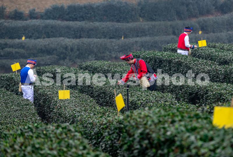 2023年2月12日,在四川省宜宾市筠连县巡司镇银星村八一茶山,茶企员工正在采摘早茶。