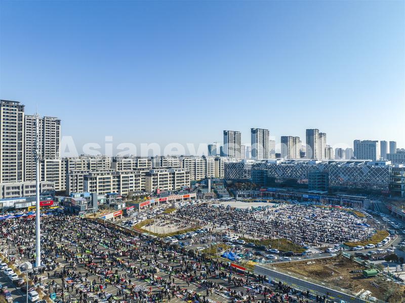 图片说明:2023年2月14日,江苏省连云港市东海县水晶城淘晶广场,水晶大集热闹非凡,人潮涌动。(航拍)