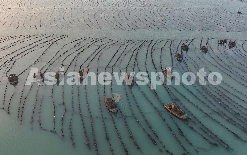 2023年2月17日,在山东省荣成市俚岛镇俚岛湾海域牡蛎养殖区,产业工人们驾驶渔船、舢舨在收获牡蛎。