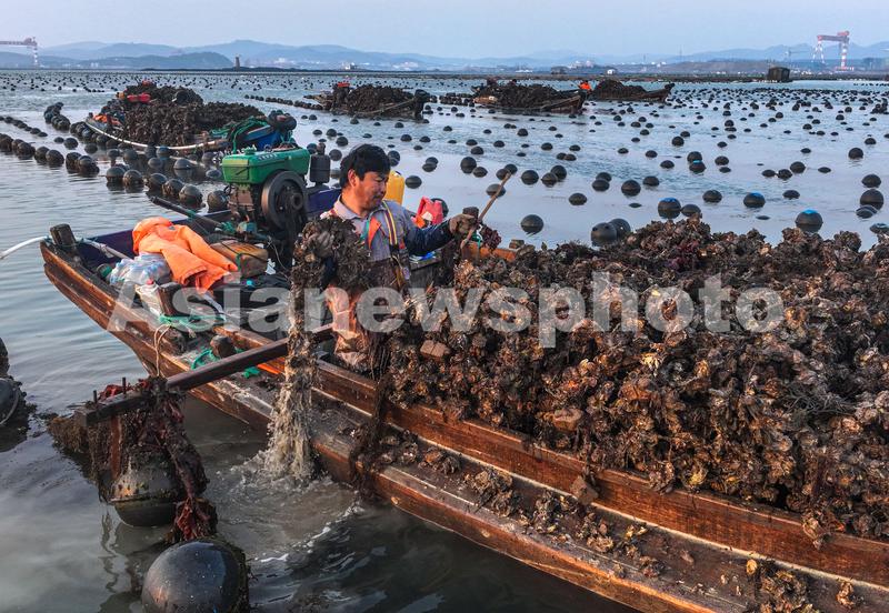 2023年2月17日,在山东省荣成市俚岛镇俚岛湾海域牡蛎养殖区,产业工人们驾驶渔船、舢舨在收获牡蛎。