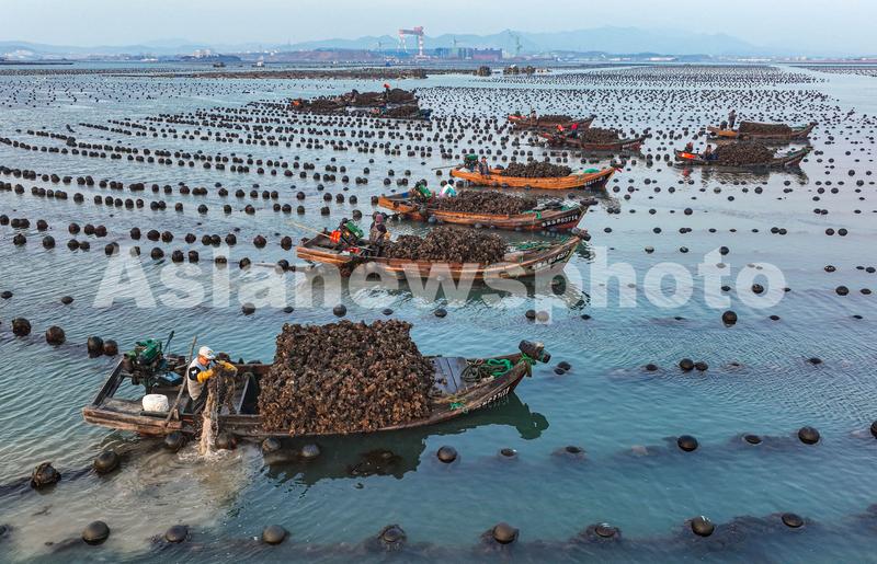 2023年2月17日,在山东省荣成市俚岛镇俚岛湾海域牡蛎养殖区,产业工人们驾驶渔船、舢舨在收获牡蛎。