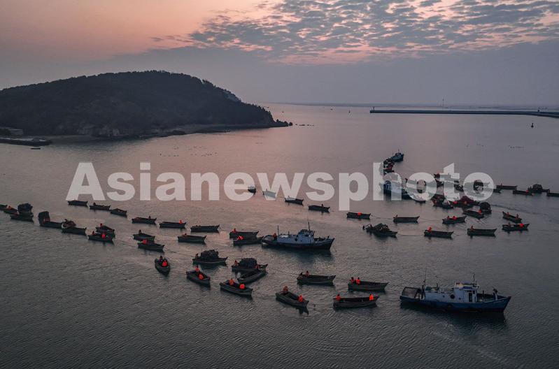 2023年2月17日,在山东省荣成市俚岛镇俚岛湾海域牡蛎养殖区,产业工人们驾驶渔船、舢舨出海收获牡蛎。
