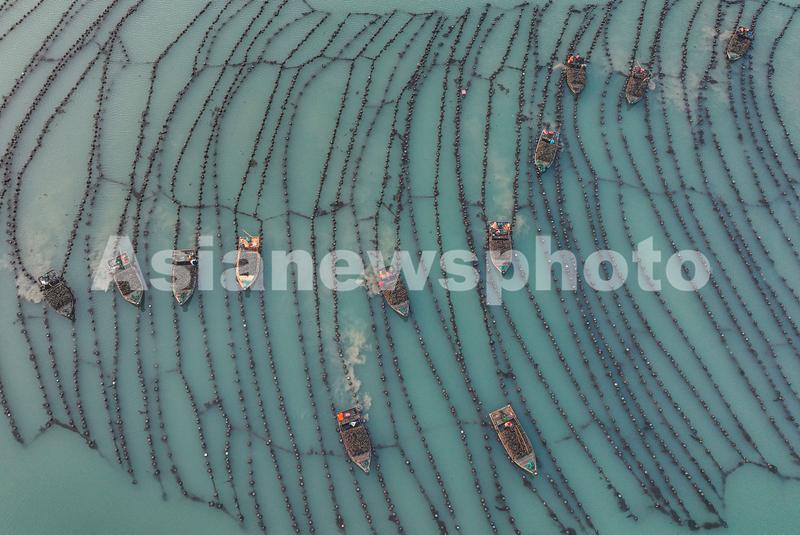 2023年2月17日,在山东省荣成市俚岛镇俚岛湾海域牡蛎养殖区,产业工人们驾驶渔船、舢舨在收获牡蛎。