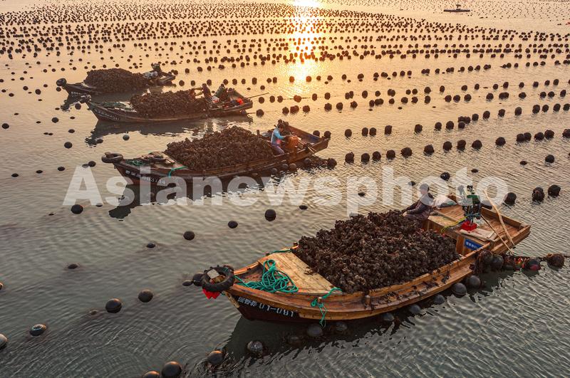 2023年2月17日,在山东省荣成市俚岛镇俚岛湾海域牡蛎养殖区,产业工人们驾驶渔船、舢舨在收获牡蛎。