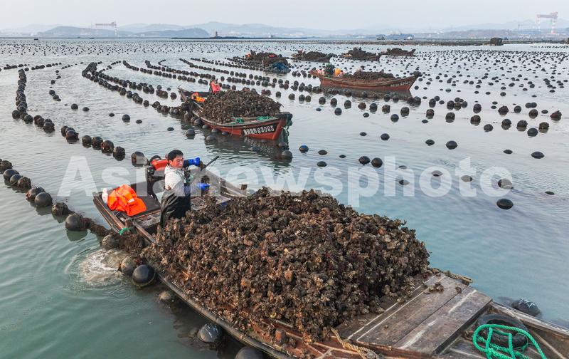 2023年2月17日,在山东省荣成市俚岛镇俚岛湾海域牡蛎养殖区,产业工人们驾驶渔船、舢舨在收获牡蛎。