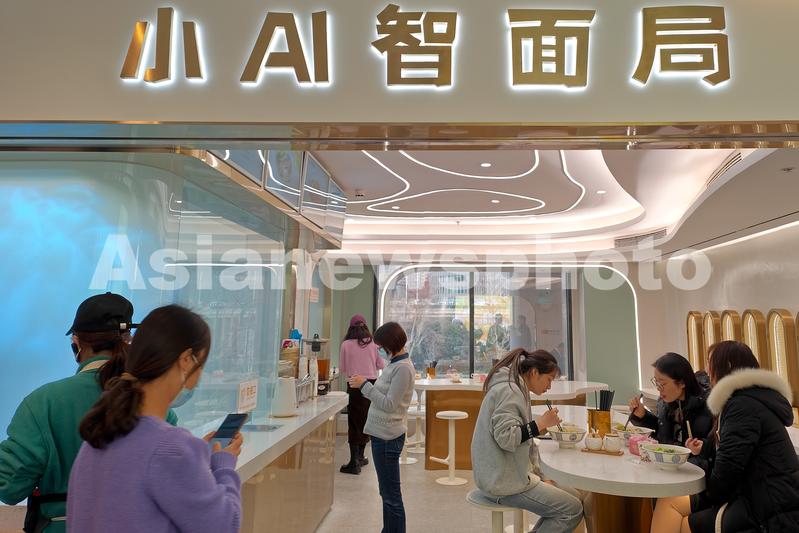 图片说明:2023年2月22日,上海长宁区有一家名为“小ai智面局”的机器人面馆,从压制面条到煮面、加浇头都由智能机械臂完成。