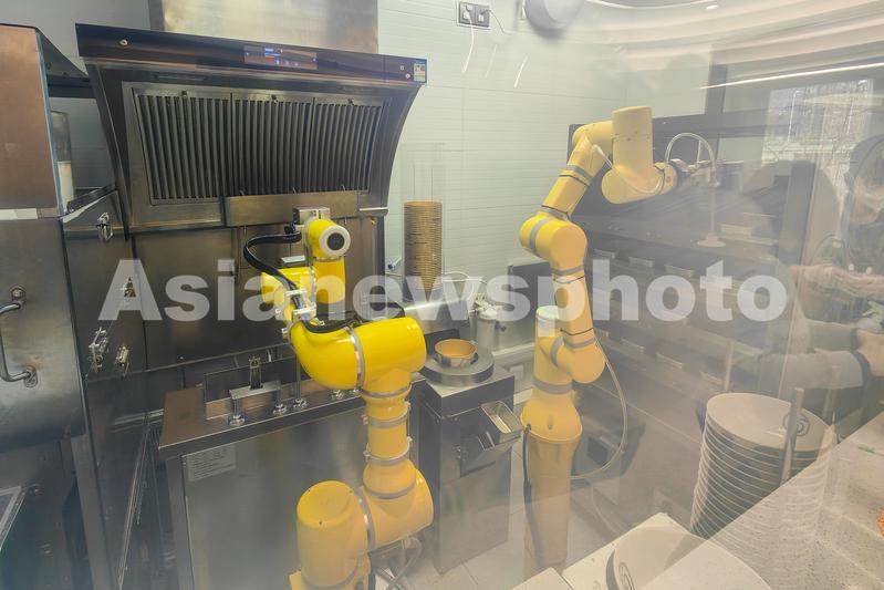 图片说明:2023年2月22日,上海长宁区有一家名为“小ai智面局”的机器人面馆,从压制面条到煮面、加浇头都由智能机械臂完成。