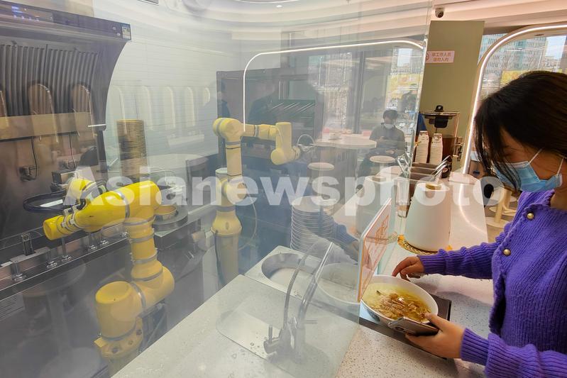 图片说明:2023年2月22日,上海长宁区有一家名为“小ai智面局”的机器人面馆,从压制面条到煮面、加浇头都由智能机械臂完成。