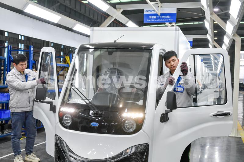 图片说明:2022年2月23日,位于浙江省湖州市长兴经济技术开发区的浙江恒源机器有限公司,技术人员忙碌组装能源纯电动物流车SKD驾驶室。