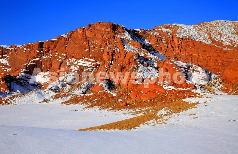 图片说明:2023年2月23日,雪霁初晴的甘肃省张掖平山湖丹霞地貌,朝霞映霞,美景如画。