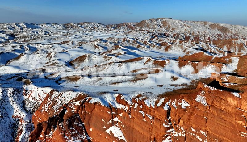 图片说明:2023年2月23日,雪霁初晴的甘肃省张掖平山湖丹霞地貌,朝霞映霞,美景如画。
