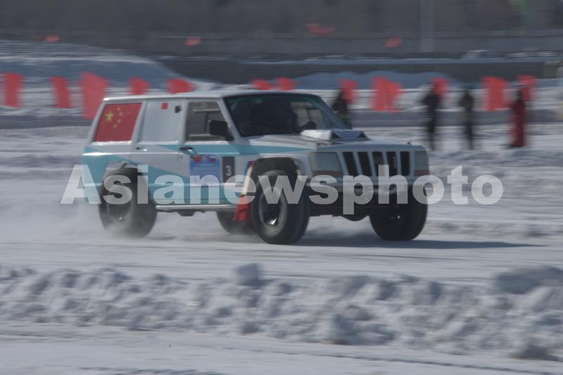 图片说明:2023年2月26日,中俄参赛选手驾驶车辆在中俄界江黑龙江江面上奔驰。