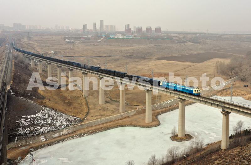 2023年2月27日,一列满载5000吨货物的列车在SS4G型电力机车的牵引下行驶在内蒙古乌兰察布市集宁区集通铁路霸王河大桥上。