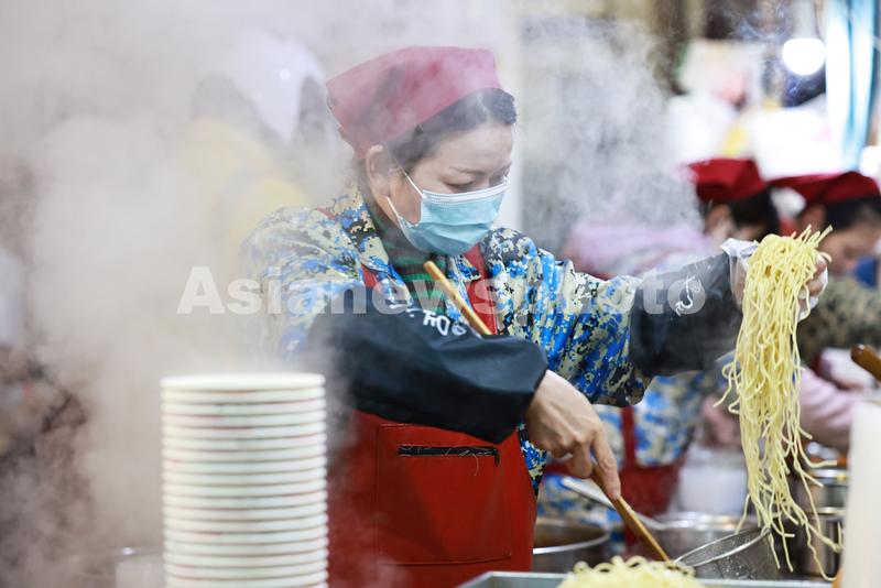 2月23日,武汉市粮道街的一家早餐店,厨师制作热干面。