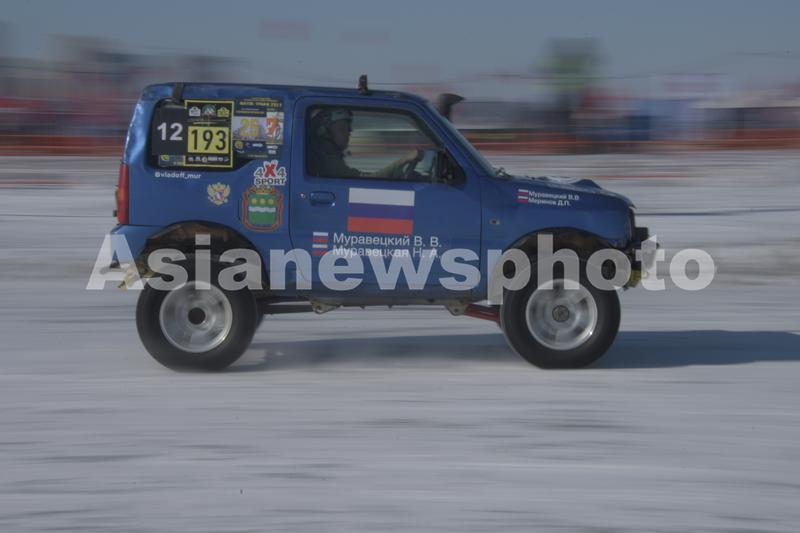 图片说明:2023年2月26日,中俄参赛选手驾驶车辆在中俄界江黑龙江江面上奔驰。