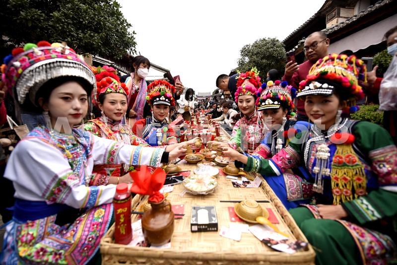 图片说明:2023年2月26日,游客在云南省大理州巍山古城南诏古街南诏养生长街宴上品尝巍山特色美食。