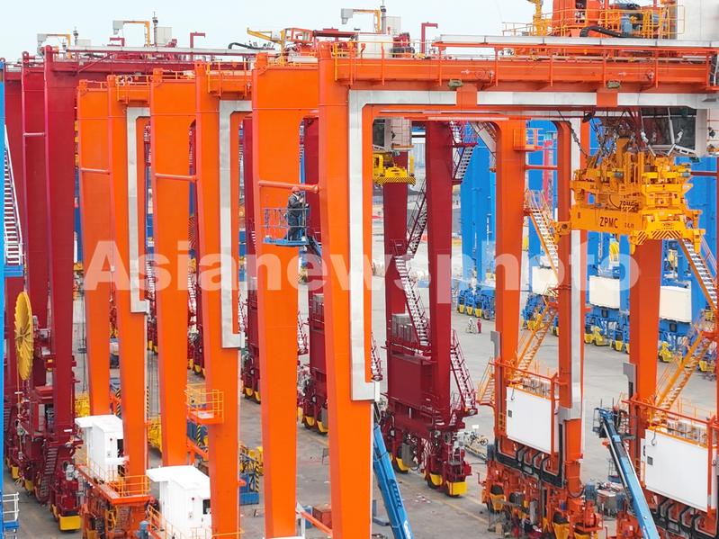 图片说明:2023年2月28日,工作人员在上海振华重工南通基地调试即将交付的港机产品。