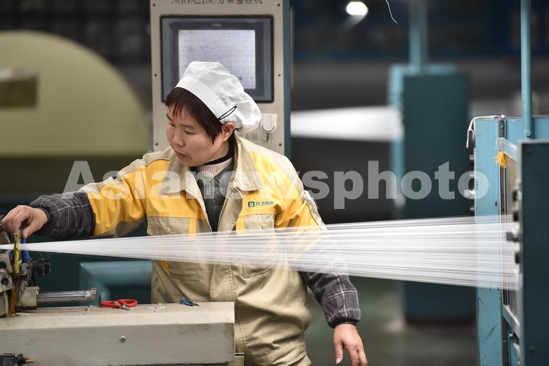 图片说明:2023年3月1日,工人在江苏省宿迁市宿城区一家纺织企业的分条车间生产作业。