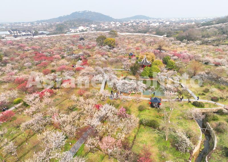 图片说明:3月1日,无人机航拍的苏州“林屋梅海”景区春花烂漫迷人景色。