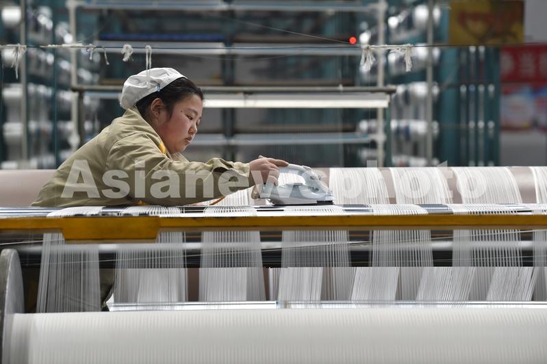 图片说明:2023年3月1日,工人在江苏省宿迁市宿城区一家纺织企业的分条车间生产作业。