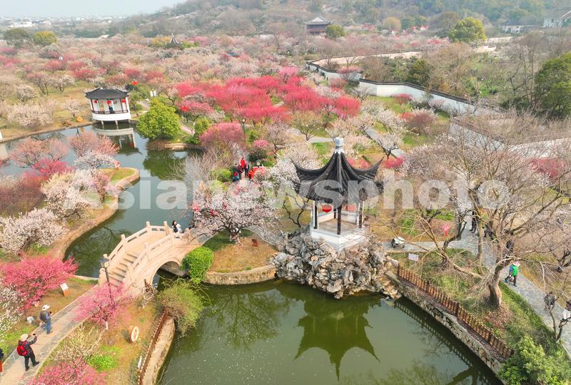 图片说明:3月1日,无人机航拍的苏州“林屋梅海”景区春花烂漫迷人景色。